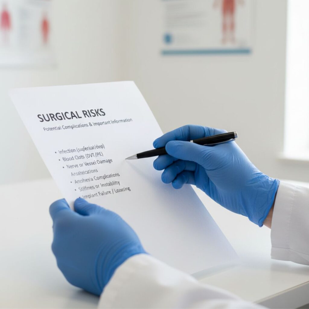 Though knee replacement is generally safe, it carries potential risks, including infection, blood clots, implant loosening, reduced range of motion, or persistent pain. Pre-operative evaluation, choosing the right procedure, and careful adherence to post-operative rehabilitation help minimize risks and improve long-term outcomes.